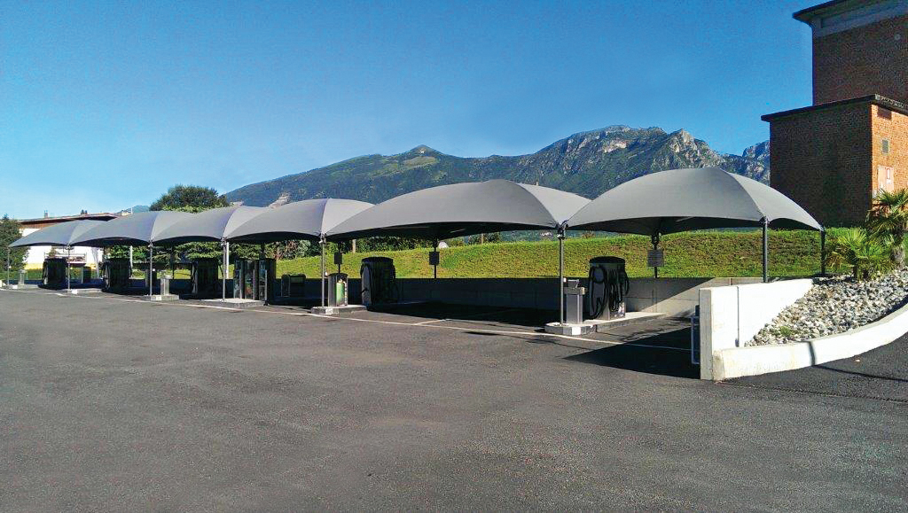 Die Grundstruktur besteht aus feuerverzinktem Stahl, weiss thermolackiert und die Dachplane ist aus einem speziellen, dehnbaren PVC, welches regen- und hageldicht ist.